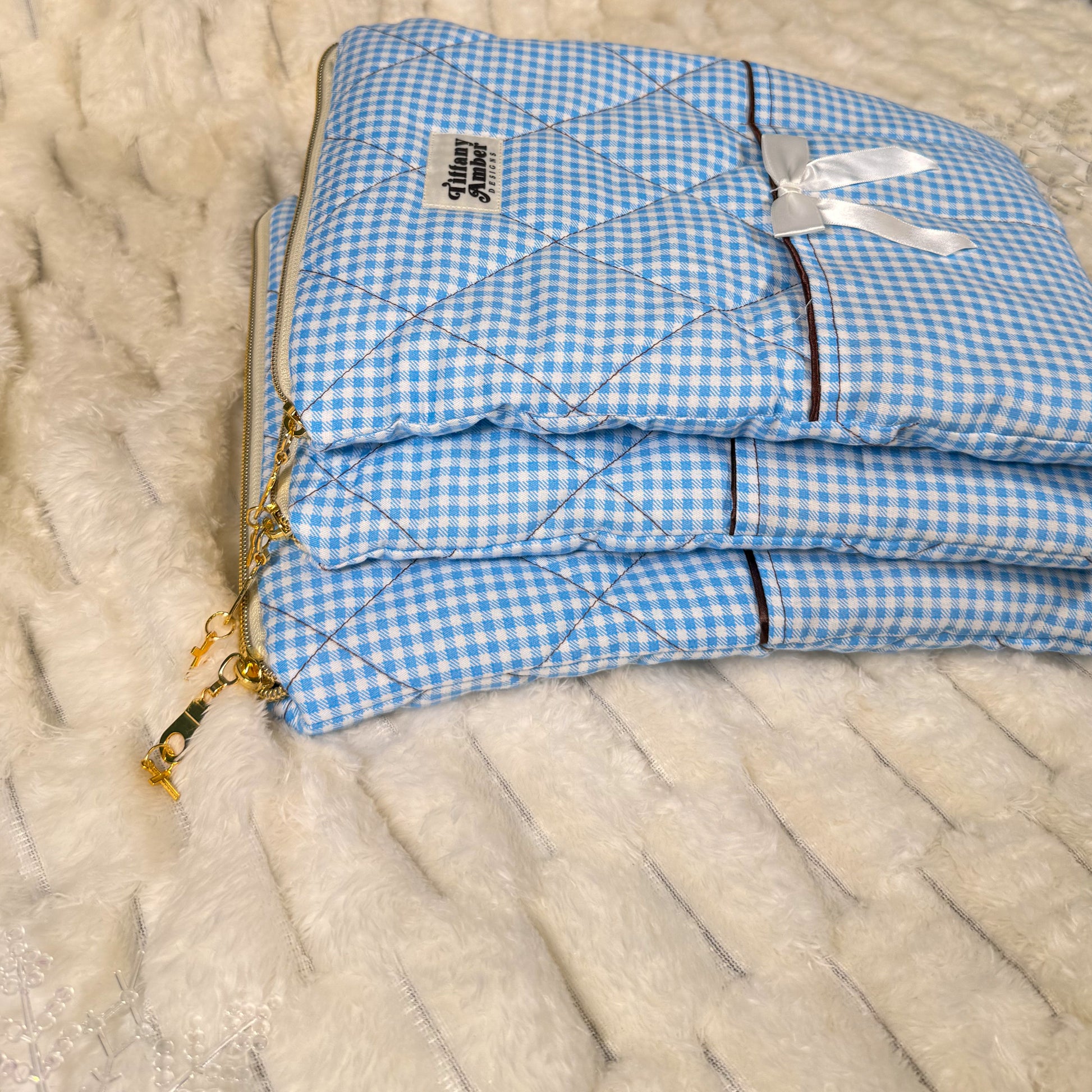 Made with blue gingham fabric, this sleeve features extra-padded double-layer batting, a satin-lined interior, and a bow on the front pocket ā ideal for pens, note cards, or small keepsakes. The zippered top keeps everything secure while adding a charming finishing touch.